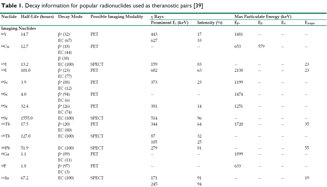 但是作为一个新生词,theranostics的定义的理解尚未统一。基于字面意思,它定义了一种诊断和治疗同时进行的疾病干预手段,虽然这种理解是狭义的,但是它更符合大家对theranostics这一新词的想象,或者说更符合我们对“诊疗一体化”这一概念的理解。1941年,Saul Hertz第一次将 131 I用于甲状腺功能亢进患者的治疗,后来又将 131 I用于甲状腺癌的治疗[2]。 1951年,美国食品和药物管理局(FDA)批准 131 I用于甲状腺疾病患者的治疗,这也是FDA批准的第一个供诊断或治疗用的放射性药物[3]。使用放射性碘同位素 131 I对良性和恶性甲状腺疾病同时进行诊断(364 keV的γ射线,发射分支比1%,可用于伽马相机成像)和治疗(606 keV的β射线,发射分支比99%,用于近距离细胞杀伤),是人类历史上最成功的诊疗一体化的经典案例。