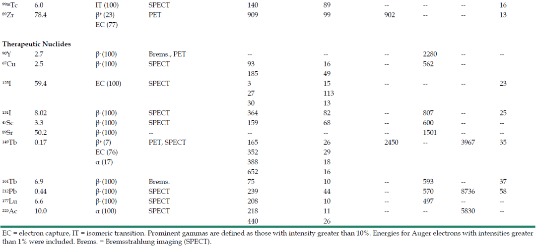 新型放射性核素的发现和制备工艺的提升也是诊疗一体化发展的重要因素,让核医学的诊断和治疗都有了更多的选择。 借助于核素不同的衰变性质,诊疗一体化方案可以先使用具有成像属性的核素(γ或β + ,“雷达”)标记放射性标记物,通过对特定的疾病靶点(如细胞表面受体或膜转运体)进行显像,达到对疾病诊断的目的。然后使用具有治疗属性的核素(α、β和EC,“核弹”)标记相同或相似的标记物,将电离辐射传递到表达这些靶点的组织和细胞中,以达到治疗疾病的目的。 目前,诊疗一体化较为热门的放射性核素及其衰变性质如表2 所示[7]。