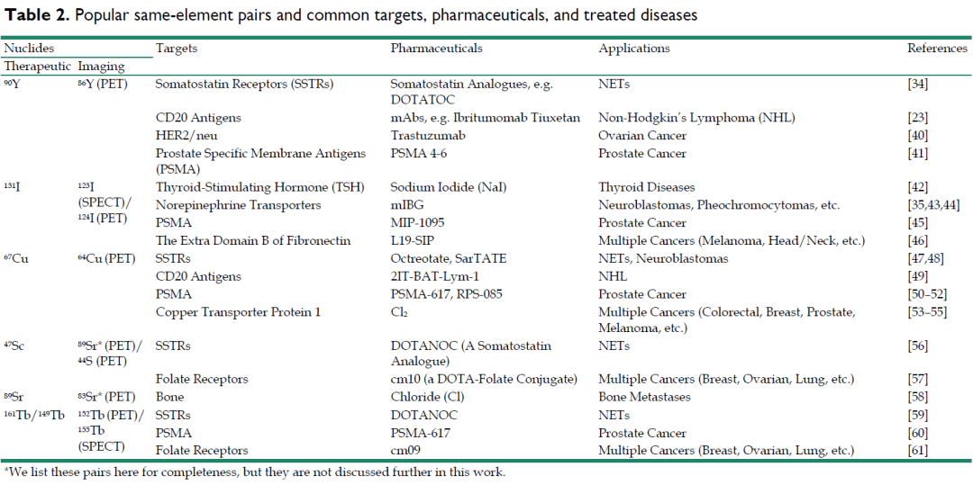 表3:诊疗一体化常用的同位素对(同一元素)及其标记的药物和对应靶点,以及治疗的疾病