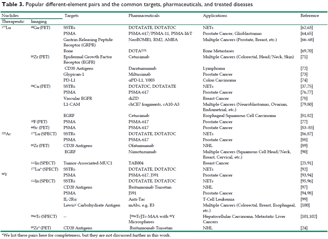 表4:诊疗一体化常用的核素对(不同元素),及其标记的药物和对应靶点,以及治疗的疾病