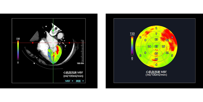 常规CT心肌灌注处理在检查中比较繁琐,联影智能CTP心肌灌注智能分析系统不仅能极大程度优化诊疗流程,还能够提供额外的参数帮助医生诊断,比如:毛细血管血容量、达峰时间。简化了心肌灌注检查的复杂度,提高了计算速度并减少了误差,为冠心病患者提供更精准的辅助诊疗决策。该系统将常规CT心肌灌注处理所需的近30分钟时间大幅缩短至平均2-3分钟,极大地简化了工作流程,使医生能够更快速、更准确地做出诊疗决策。