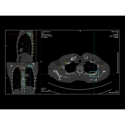 联影智能CT骨转移智能分析系统可秒级检出及分类原发骨肿瘤、溶骨性骨转移、成骨性骨转移、混合型骨转移与其他骨异常病灶,同时精准标识肋骨、椎体、盆骨位置,自动提供病灶定位信息,系统支持MPR三视图同步对比阅片、一键归档PACS功能,辅助医生高效、精准地完成肋骨、椎骨与盆骨骨疾病的诊断,避免漏诊。