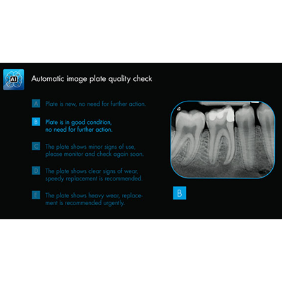In conjunction with VistaScan image plates, Vistasoft AI facilitates automated checking of the quality of image plates. Here, the AI-assisted system automatically checks every single X-ray image to see if the image quality is deteriorating. In the process, the system assesses the condition of the image plate and automatically recommends its replacement if necessary to ensure that image quality remains consistently high at all times.