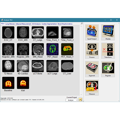 Analyze 15.0 is a robust research software for advanced biomedical imaging visualization, manipulation and measurement. It has been carefully designed to provide an intuitive and facile interface that allows full exploration of biomedical imaging data. The software features integrated modules that provide access to complementary tools for fully interactive multi-dimensional display, processing, segmentation, registration and measurement of biomedical imaging modalities.