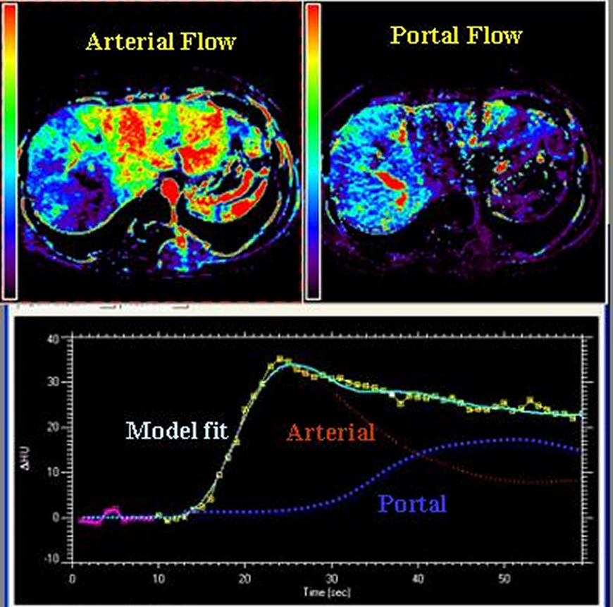 Case #1 (left) CT Perfusion reveals abnormal flow in a patient with liver mass. The plot displays the model fitted curve (cyan) compared to the measured data (yellow). The fitted arterial (red) and portal (blue) components are also displayed. Data courtesy of Drs Alex Pitman and Eddie Lau, Peter MacCallum Cancer Center.